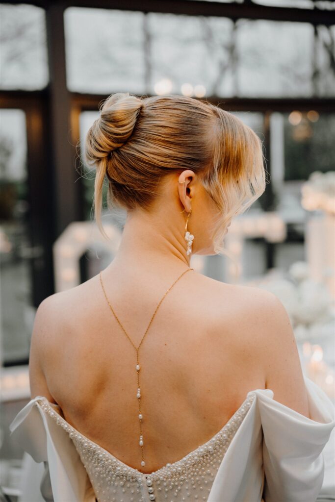 Beim Carmen Ausschnitt oder schulterfreien Kleid liegt der Fokus stärker auf Schultern und Dekolleté. Hier kann eine schmale Kette oder ein bewusst gewähltes Statement Element funktionieren. Ein rückenfreies Brautkleid eröffnet zusätzlich die Möglichkeit für eine Rückenkette. In diesem Fall sollte der Brautschmuck vorne reduziert bleiben, damit der Look nicht überladen wirkt.
